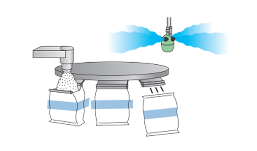 AKIMist® is unique for its non-wetting ability due to the extremely tiny droplet size around 7.5 µm – making it ideal for sensitive environments. The tiny droplets can also suppress dust, making it an ideal combination for a food packaging line.