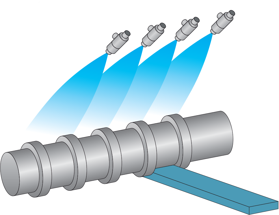 Para el proceso de enfriamiento secundario en la máquina de colada continua (CCM), se necesita una fuerza de impacto fuerte para atravesar la superficie en ebullición. Para enfriar las losas de acero, es necesario una distribución uniforme de la aspersión con el mayor impacto posible para garantizar una textura de superficie lisa. Ikeuchi ofrece la boquilla de aspersión neumática DOVEA. Esta puede generar un amplio rango de caudal sin cambiar el ángulo de aspersión.